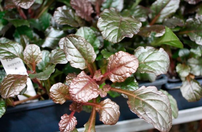 - Металіка Кріспа. Висота рослини близько 5 сантиметрів. Невеликі жаті листові пластини мають зелено-пурпурний колір з металевим відливом.