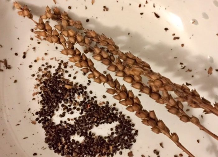 В чашечках на дні приквітків знаходяться великі ребристі насіння чорного забарвлення. При сильному вітрі вони можуть випасти на ділянку. Збір насіння проводять з останніх днів серпня і до початку жовтня. Потім насіння слід обов'язково досушити, для цього їх необхідно розкласти в добре вентильованому приміщенні з невисокою вологістю повітря. Сухі насіння можна прибрати на зберігання.