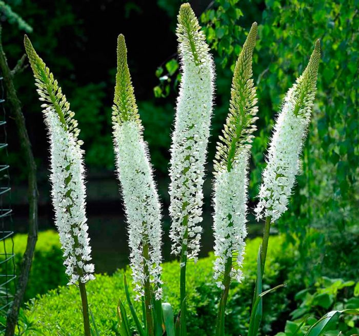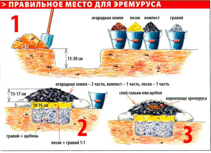 Якщо грунт на ділянці добре дренирована, то таку клумбу робити не потрібно. Посадочна яма повинна бути широкою, а її глибина може варіюватися від 25 до 30 сантиметрів. На її дно вкладається дренажний шар п'ятисантиметрової товщини, який присипається почвосмесью. Поверх неї викладається корнедонце, при цьому постарайтеся розправити ніжні корінці так, щоб вони дивилися на всі боки або дуже обережно перевалите рослину з горщика. Заглиблювати цибулинки слід на 5-7 сантиметрів. Якщо проводиться висадка великих видів, то між кущиками слід дотримуватися дистанцію від 0,4 до 0,5 м, а для дрібних видів вона становить 0,25–0,3 м. Ширина міжрядь повинна бути близько 0,7 м. Висаджені рослини треба полити. Вирощене з насіння рослина зацвіте лише через 4-7 років після появи сходів, але тільки в тому випадку, якщо грунт, де вирощується даний eremurus, не буде надмірно насичений поживними речовинами. При цьому слід врахувати, що в жирній ґрунті такої квітка нарощує пишну зелену масу і при цьому повністю перестає цвісти.