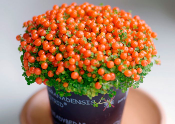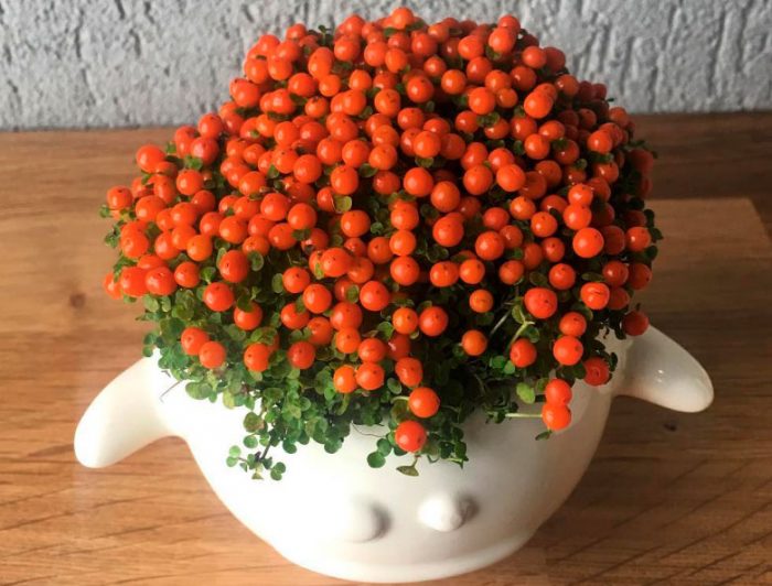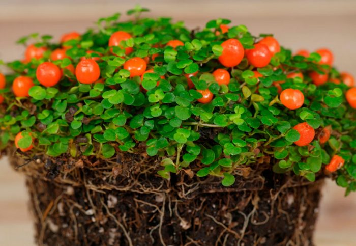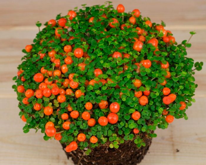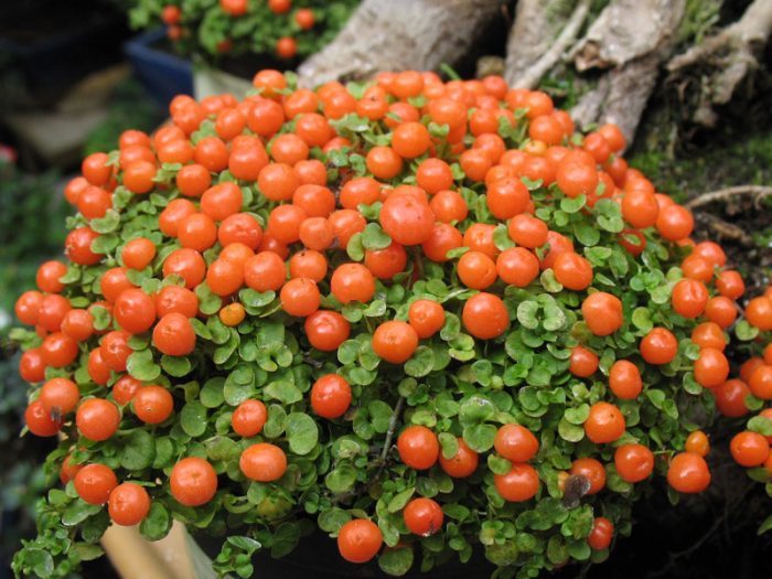 Або нертера гранадская. Рослина Родом з Мексики і Центральної Америки. Пагони у нього тоненькі і повзучі. Довжина ланцетовидно-округлих листових пластин 3-7 мм, при цьому їх черешки не більше 2-4 мм В червні на кущі з'являються жовто-зелені квіти. Коли рослина відцвіте, на ньому утворюються помаранчеві ягідки, які не облітає всю осінь, а при сприятливих умовах і всю зиму.