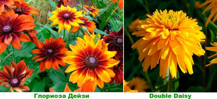 - Глоріоза Дейзі — вирощують як однорічник або багаторічник, висота кущика приблизно 1,2 м, діаметр суцвіть близько 16 сантиметрів, до їх складу входять 1-3 ряду однотонних або строкатих квіточок коричнево-жовтих або жовтих квітів, а серединка трубчастої форми забарвлена в темно-коричневий колір;