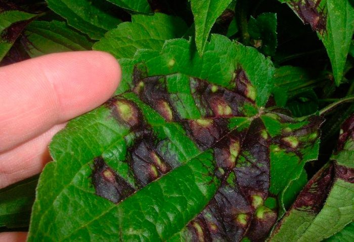 Дуже рідко рудбекія захворює борошнистою росою. При цьому на наземних частинах кущика з'являється рыхловатый наліт білого кольору. Щоб вилікувати заражений примірник, його треба обробити розчином колоїдної сірки (1%) або мідного купоросу (на 1 відро води 80 грам речовини). Якщо на листових пластинках з'явилися плями бурого кольору, вони почали стоншується і в'янути, то це означає, що кущ заражений листової нематодою. Уражені і травмовані рудбекії в цьому випадку слід видалити з ділянки, а решта кущики в профілактичних цілях обробляють Немагоном, Базамидом або Немафосом, при цьому треба дотримуватися інструкції, прикладеної до препарату. У тому випадку, якщо ураження зазнали однорічні рослини, то з настанням осіннього часу треба буде знищити всі їх залишки, при цьому ділянка гарненько перекопують і проливають розчином марганцевого калію, який повинен бути дуже міцним.