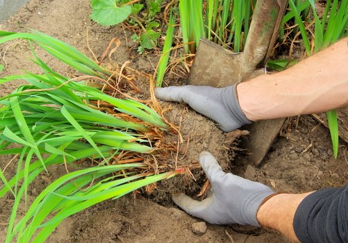 На одному і тому ж місці вирощувати таку квітку можна близько 15 років, але з часом якість цвітіння буде погіршуватися. Якщо ви побачите, що ваш раніше розкішний і вже немолодий кущик став менш ефектним (квіточки подрібнювали, і їх стало менше на квітконосі), то це значить, що настав час для пересадки. Для початку обкопайте кущик по його зовнішньому кордоні і акуратно витягніть разом із земляною грудкою, при цьому постарайтеся не травмувати корінці. Кореневу систему потрібно промити з садового шланга, а потім її можна обережно поділити на окремі віяла. Якщо у вас є певні навички, то поділити кущик ви зможете руками, але якщо ви використовуєте ніж або секатор, то місця зрізів обов'язково потрібно піддати обробці фунгіцидом. Висаджувати і робити пересадку рекомендується в похмурий день, якщо ж відповідний погоди доведеться чекати досить довго, то кущики або деленко рекомендується прикопати в піску, там вони можуть пробути близько половини місяця. Перш ніж висаджувати примірник, потрібно провести укорочення корінців, а також слід зрізати всі мертві і загнили. Потім подрежьте листочки на висоту 15-20 сантиметрів по формі переверненої літери «V». Підготовлену деленку посадіть на постійне місце.