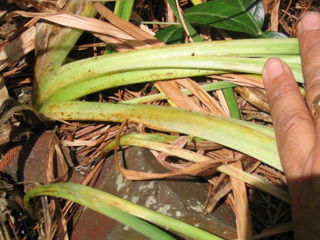 Коренева гниль. Вона найчастіше з'являється у весняний час. У ураженої кущика припиняється ріст молодого листя, вона стає жовтою і з легкістю витягують з ґрунту. Викопайте хворий кущик і видаліть всі загнили ділянки, а потім промийте його в розчині марганцевого калію рожевого кольору. Ранки потрібно обробити фунгіцидом. Система коренів повинна добре просохнути, і для цього знадобиться 2 дні. Потім кущик треба висадити в інше місце. Цвісти така рослина не буде пару років. Там де ріс уражений кущик, не рекомендується висаджувати лілейник мінімум 12 місяців.