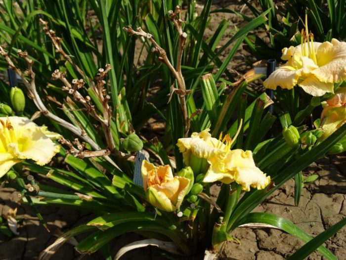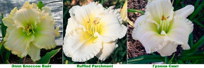 а) Еппл Блоссом Вайт. Жовтувато-білу квітку, має сильно гофровані краї пелюсток. У висоту досягає 0,83 м, на квітконосах є по 2 гілки з 25 бутонами.