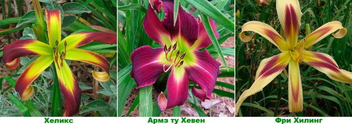 б) Армз ту Хевен. Забарвлення горла у цього гіганта зеленувато-жовтий, а довгі пелюстки забарвлені в червоно-ліловий колір. Пишне цвітіння. Кущик заввишки досягає 0,9 м. На одному квітконосі виростає від 16 до 20 квіточок.