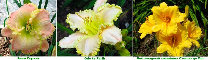 б) Ode to Faith. Центральна смуга пелюстки пофарбована в насичений жовтий колір з рожевим відливом. Кромка пелюсток золотиста гофрована. Горло зеленого забарвлення. Квітконіс заввишки досягає 0,84 м, квіточки мають ніжний запах і діаметр близько 15 сантиметрів.