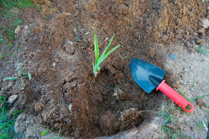 Для кожного кущика або деленко слід підготувати окрему посадкову ямку, глибина якої повинна бути близько 0,3 м. Також пам'ятайте, що даний квітка на одному місці буде рости досить довго, і за цей час він розростеться в діаметрі до 0,5–0,7 м, тому постарайтеся залишити таке відстань між кущиками, щоб їм не було тісно. У кожну з підготовлених луночек треба гіркою насипати грунтосуміш, що складається з торфу, піску і перегною, потім додайте фосфорно-калійне добриво або деревну золу, змішану з суперфосфатом. Потім в лунку треба помістити систему коренів рослини і обережно її розправити, при цьому стежте, щоб під нею не залишалося порожнього місця. Після цього наповніть лунку грунтом, але не до верху. Потім, притримуючи кущик рукою, гарненько утрамбуйте грунт і влийте в лунку стільки води, щоб вона виявилося повною. У тому випадку, якщо рідина швидко вбереться в грунт, то це означає, що земля погано утрамбована, тому насипте в лунку сухого ґрунту і ще раз гарненько її ущільніть. Потім треба заповнити лунку до країв грунтом. При посадці слідкуйте за тим, щоб коренева шийка квітки не була заглублина в ґрунт більше ніж на 20-30 мм, в іншому випадку можуть спостерігатися затримки росту, а також поява гнилі. Якщо ви посадили лілейник, дотримуючи всі правила, то води в лунки має бути достатньо кущика для повного вкорінення.