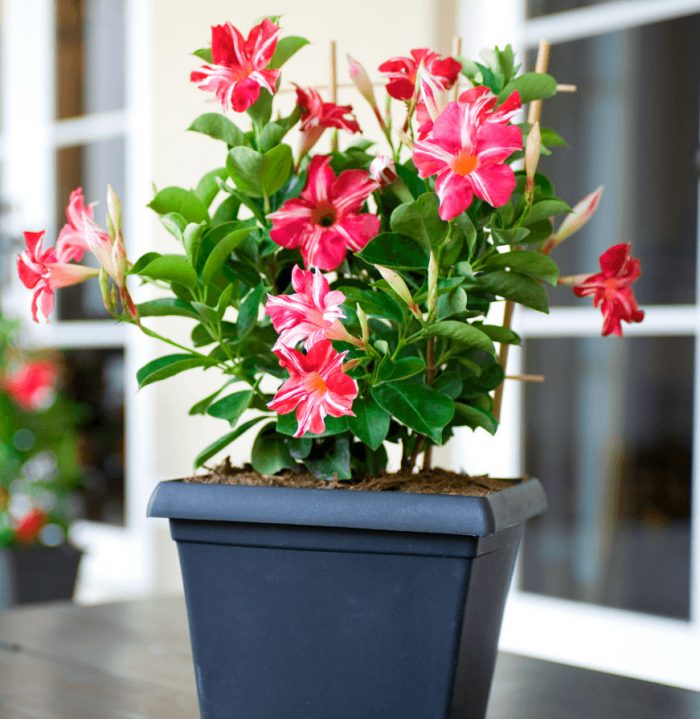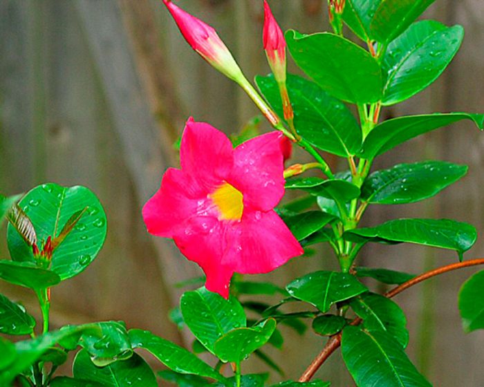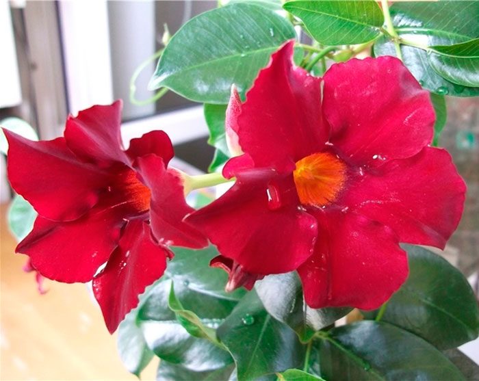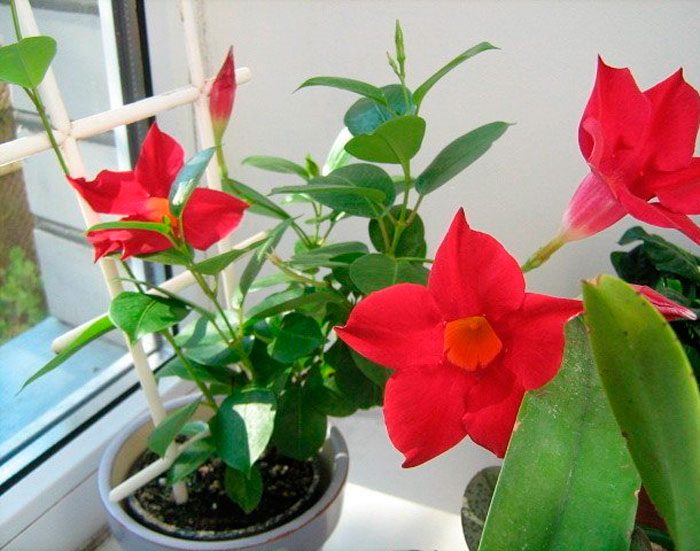 У кімнатних умовах дипладению культивують як лазить рослини або компактного кущика. Запашні квітки воронкоподібної форми складаються з 5 пелюсток, які можуть володіти рожевим, червоним, білим або малиновим забарвленням. На дорослому кущі в один і той же час може відкритися до 80 квіток, при цьому радувати своєю красою вони будуть більше тижня.