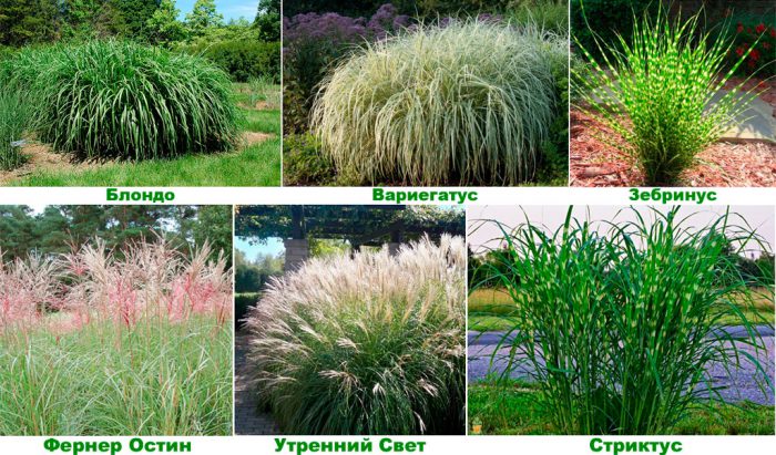 - Міскантус Зебринус (в деяких випадках іменують міскантус Зебрина). Ряболисті кущик на зелених листових пластинках має жовті смужки, які розташовуються поперечно.