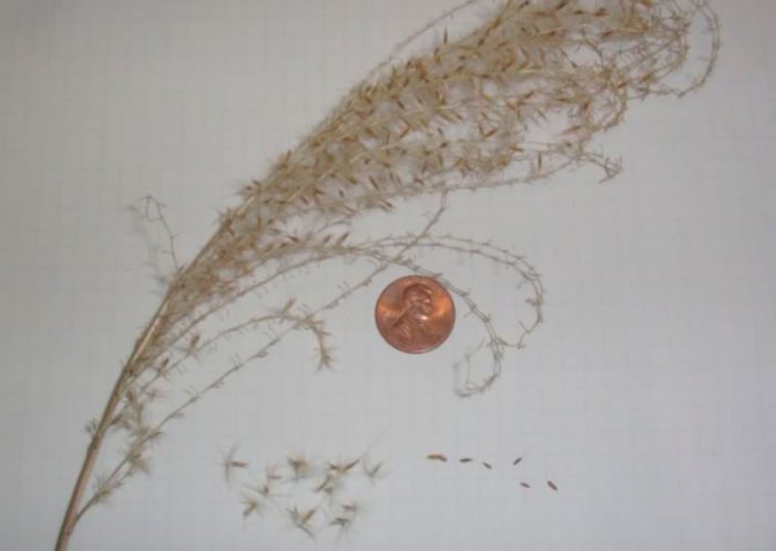 Ще міскантус можна виростити з насіння. Насіння перед посівом не потрібно готувати, але якщо ви вибрали цей спосіб розмноження, то слід врахувати, що вам доведеться запастися терпінням. Справа в тому, що такий злак, вирощений з насіння, досягає піку своєї декоративності лише через 3 або 4 роки після посіву. Висівати насіння рекомендується індивідуальні торф'яні горщики, а після того як в весняне час грунт добре прогріється, розсаду міскантуса можна буде пересадити у відкритий грунт. Однак слід враховувати, що вирощені з насіння рослини не здатні зберегти сортові ознаки.