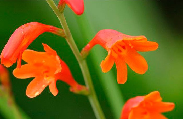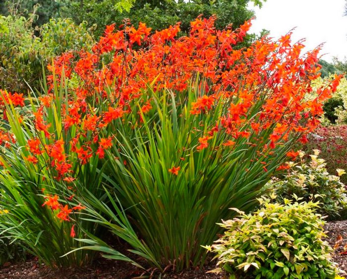 - Крокосмия Люцифер. У висоту кущ може досягати 150 сантиметрів. На його прямих квітконосах розташовуються квітки насичено-червоного кольору. Даний сорт має високу морозостійкість і якщо в регіоні, де він вирощується, зими не дуже морозні, то клубнелуковички такого рослини можна залишити в грунті на зимівлю.