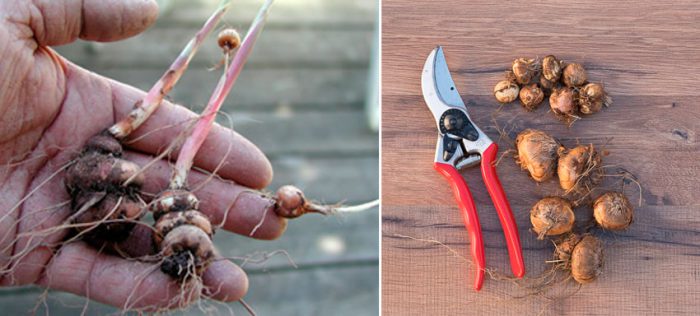 Поділ, як правило, проводять після того, як посадка стає дуже густий. Для цього у весняний час потрібно викопати клубнелуковицу і від батьківського цибулинки обережно відірвати діток, які потім висаджуються на постійне місце. При цьому виробляти посадку діток рекомендується в той же часовий проміжок, що і висадку розсади, а саме, в останні дні квітня або перші — травня. Якщо є бажання, то для початку відокремлених діток можна розсадити за індивідуальним горщикам, де вони будуть рости до травня або червня. А далі їх треба буде пересадити у відкритий грунт.