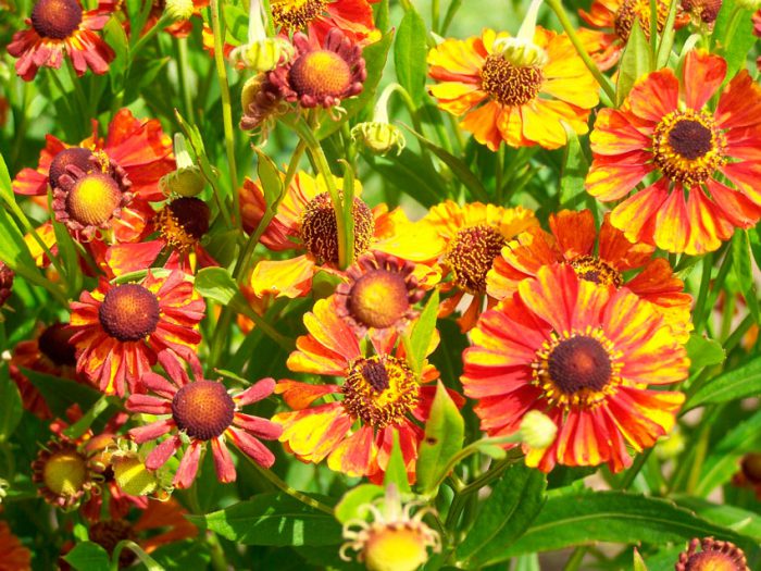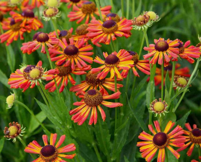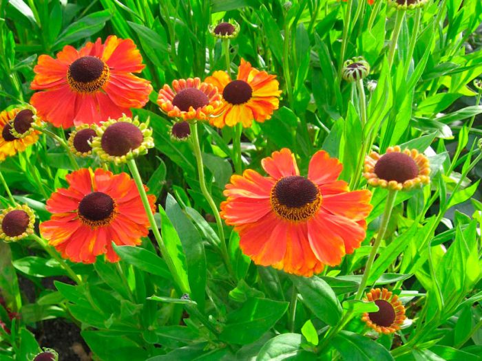 - Кокарда. Кущики у висоту досягають 1,2 м. Діаметр суцвіть-кошиків близько 4,5 сантиметрів. Трубчасті квіточки коричнево-жовті, язичкові — коричнево-червоні, кромка жовта, однак до центру вони стають червоними. Цвітіння триває 6 тижнів і починається в серпні.