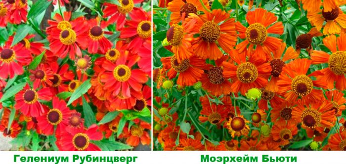 - Геленіум Рубинцверг (Рубіновий Гном). Цей сорт користується найбільшою популярністю. Висота щільного кущика близько 0,65 м. Забарвлення суцвіть рубіновий. Початок цвітіння спостерігається в останні дні липня. Такий сорт можна легко сплутати з сортом Розі Джем.