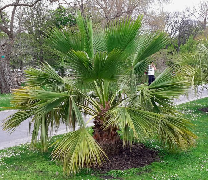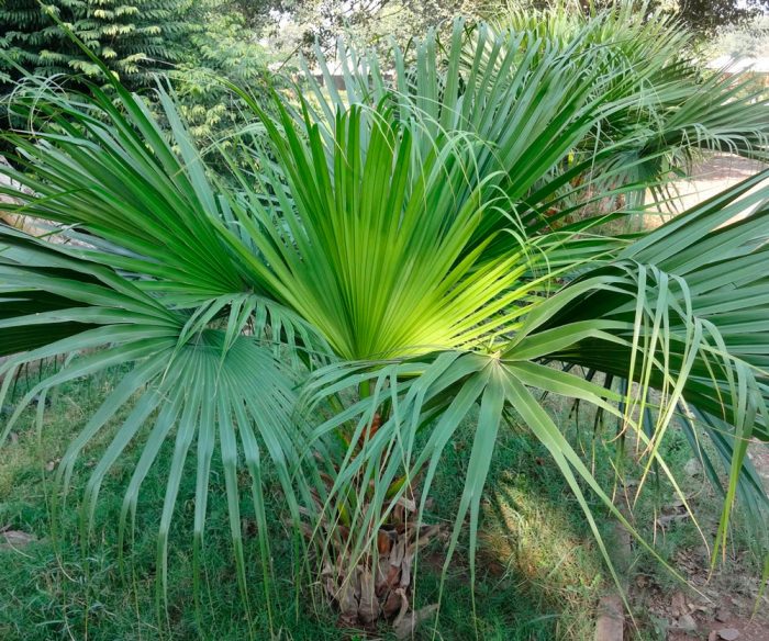 Або лівістона ротундифолия. У природі цей вид можна зустріти на прибережних піщаних грунтах Молуккських островів і Яви. Висота стовбура до 14 метрів, а в поперечнику він сягає близько 17 сантиметрів. Зелені глянцеві віялові листові пластини округлої форми в діаметрі досягають близько 150 см, причому на 2/3 довжини вони розсічені на складчасті сегменти. Листя має довгі (до 150 см) черешки, які в нижній 1/3 частини густо всипані шипами. Довжина пазушного суцвіття близько 150 см, до його складу входять квітки жовтого забарвлення. Так як даний вид користується найбільшою популярністю у квітникарів, то в цій статті було описано, як доглядати саме за ним.