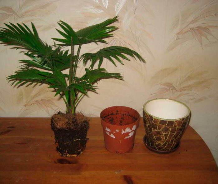 Як зрозуміти, що пальму вже потрібно пересаджувати? Проводять пересадку пальми тоді, коли ґрунт у горщику прокисне, при цьому у неї з'являється нехороший запах. Також пересаджують і то рослина, у якого кореневій системі стало занадто тісно в горщику. Найчастіше дорослі кущі пересаджують 1 раз в 3 роки, причому проводити процедуру потрібно в березні, акуратно перевалюючись пальму зі старої ємності в нову. Краще всього для цього взяти грунтосуміш з рН 5,6–7,5, крім цього вона повинна добре пропускати воду і дуже довго зберігати свою структуру. Приблизний склад субстрату наступний: кора сосни (2 частини) фракції не менше 2 см, великий перліт (1 частина), кісткове борошно (1/10 частина), грубий торф (2 частини), деревне вугілля (1 частина) фракції не менше 1 см, доломітовий щебінь (фракція 1,2 см) або галька (1 частина).