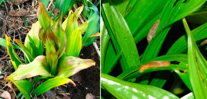 На такому квітці можуть оселитися равлики, а також слимаки. Такі шкідники живляться його листочками. Якщо грунт практично постійно буде перезволожена, то це може стати причиною розвитку сірої гнилі. Для того щоб уникнути появи слимаків, поверхню міжрядь потрібно покрити шаром подрібненого черепашок, дрібним гравієм або шкаралупу від яєць. А ще по периметру ділянки можна розмістити жолоби із пластику, які потрібно влити воду. Вони стануть непереборною перешкодою для слимаків та равликів.