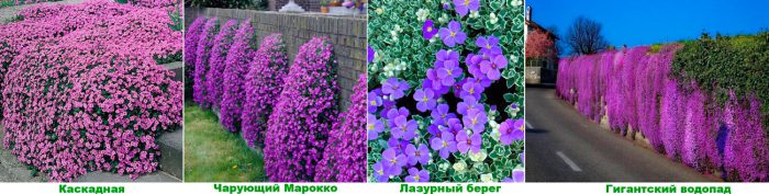 - Гігантський водоспад. Це сортосуміш, що включає в себе рослини різного забарвлення, а саме: рожевого, бузкового, фіолетового, червоного та ін. Висота такого зимоустойчивого багаторічної рослини не перевищує 15 сантиметрів. Квіточки мають сантиметровий діаметр.