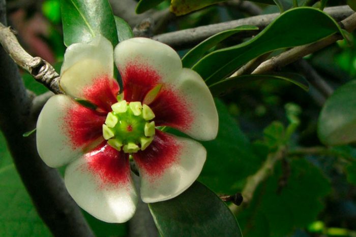 Шкірясте на дотик листові пластини голі й гладенькі насичено-зеленого забарвлення, вони є короткочерешковим і супротивнорасположенными. Форма цілокрайого листя може бути овальної або ланцетної, верхівка у них загострена, їх довжина може варіюватися від 8 до 20 сантиметрів, а ширина ― від 5 до 8 сантиметрів. Існують також і дрібнолисті форми цієї рослини. Воскових пелюсток на квітках від 4 до 9, вони мають білувато-зеленим забарвленням з плямами жовтого або рожевого кольору. Квітки в діаметрі досягають близько 50 мм і мають дуже приємний, але ледве вловимий запах. Розкриття квіток відбувається у вечірній час, при цьому до ранку вони закриваються. Плід представляє собою круглу коробочку, в діаметрі досягають 50-80 мм, його поверхня покриває зеленувата шкірка. Шкірка плоду по мірі дозрівання стає більш темною, а потім коричневою. Він зіркоподібно розкривається, і у нього всередині червоної м'якоті можна виявити велику кількість насіння. Вживати плоди в їжу не можна, а якщо сік потрапить на шкіру, то через неї може розвинутися роздратування.