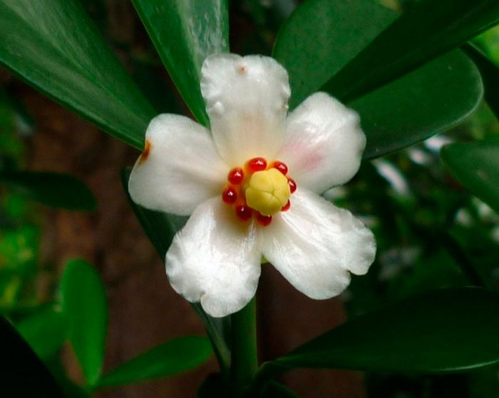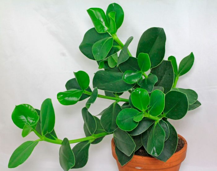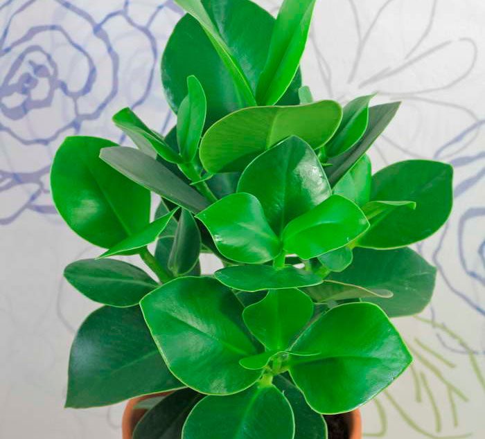 Або клузія рожева (Clusia rosea). Цей вид у домашніх умовах, стали вирощувати порівняно недавно. Таке компактне пряморослое рослина, що є вічнозеленим, відрізняється невимогливістю до догляду і до умов утримання. Його висота може доходити до 100 див. Цілокраї великі супротивнорасположенные листові пластини мають глянсову і шкірясту на дотик поверхню. Кожна наступна пара листя по відношенню до попередньої розміщується під кутом рівним 90 градусів. Це рослина медленнорастущее і квітки на ньому з'являються дуже рідко. Якщо за ним правильно доглядати і забезпечити йому оптимальні умови для росту, то на кущі з'являться воскові (як у магнолії) запашні квітки, що досягають в поперечнику близько 50 мм, вони білі з цятками рожевого кольору і з насичено-жовтою серединкою.