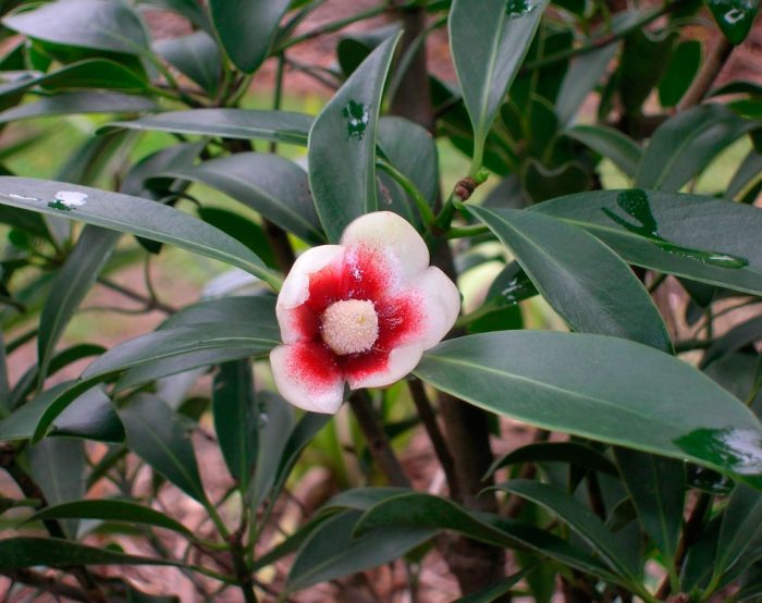 Вид представлений ефектним вічнозеленим невеликим деревом або чагарником. Деревце у висоту може досягати близько трьох метрів. Шкірясте на дотик листові пластини ланцетної форми в довжину досягають до 75 мм. Колосовидні квітки насиченого забарвлення мають діаметр близько 50 мм, а на внутрішній поверхні пелюсток у них розташовуються темно-червоні цятки.