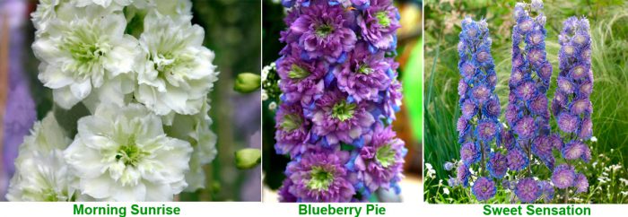 Багаторічні гібридні рослини поділяються на групи за місцем свого походження. Найбільшою популярністю користуються дельфініуми новозеландські (New Millennium Delphiniums, New Zealand Hybrids), шотландські (гібриди F1) і мафинские гібриди, названі на честь радгоспу «Мафино». У кожній з груп є свої відмітні ознаки і позитивні сторони. Приміром, марфинские мають дуже гарний зовнішній вигляд, а також відрізняються чудовою морозостійкістю, ще у них є досить великі напівмахрові квіточки з вічками, пофарбованими в насичений контрастний колір (сорти: «Морфей», «Рожевий захід», «Блакитне мереживо», «Весняний сніг»). Однак для вирощування марфинского насіння дельфініума не підходять, тому що в цьому випадку не зберігаються сортові ознаки.