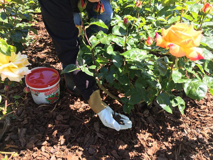 Після того як в весняне час буде проведена обрізка троянди, проводиться підгодівля, для цього на 1 квадратний метр береться за 20 грамів аміачної селітри і сульфату амонію. Через півмісяця треба повторити внесення азотосодержащего добрива. Під час бутонізації для підгодівлі троянди використовують наступну поживну суміш: 30 грам суперфосфату, від 20 до 30 грамів аміачної селітри, 10 грамів калійної солі (на 1 квадратний метр). Замінити такі поживні суміші, які використовуються для підгодівлі, можна «Кемирой універсал», при цьому на 1 квадратний метр береться від 30 до 40 грам речовини. Коли закінчиться цвітіння, для підгодівлі використовують комплексне добриво з мікроелементами. З останніх липневих днів треба припинити підживлення кущика азотовмісні добривами. З серпня по вересень в ґрунт треба внести суперфосфат і калійну сіль, при цьому на 1 квадратний метр береться за 30-40 грам добрива. Якщо є бажання, то підгодовувати кущові троянди можна по черзі то органічними, то мінеральними добривами. В якості органічних добрив рекомендується використовувати гнойову рідоту, курячий послід або деревну золу.