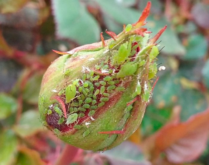 На кущової троянди можуть оселитися різні шкідники, які поділяються на сисних і гризучих. До грызущим відносяться личинки пильщиків, жуки й гусінь, а до сосним ― кліщі, цикади, попелиці, щитівки та білокрилки розанные. Комахи, які є сисними, селяться на надземних частинах троянди. Вони здатні проколювати їх і висмоктувати рослинний сік. В результаті листові пластини стають жовтими, скручуються і облітають, а також може статися засихання стебла. Грызущие комахи харчуються безпосередньо частинами троянди. В результаті ріст і розвиток кущика сповільнюється, цвітіння стає мізерним, і рослина втрачає свій привабливий зовнішній вигляд. Боротися з шкідливими комахами можна після того, як вони поселятися на рослині, але досвідчені садівники рекомендують навесні провести профілактичну обробку. Це треба зробити до того, як набубнявіють бруньки, а використовувати для цього слід такі інсектицидні засоби, як: карбофос, актеллик або рогор. Також можна для цієї мети використовувати розчин, до складу якого увійшли відро води і 2 грами гасу. В осінній час після того, як буде проведена обрізка троянд, треба прибрати всі обрізані гілочки і опале листячко і спалити їх. Потім треба обробити сам кущик і поверхню грунту під ним спеціальними засобами.