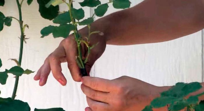 - З сортовий троянди зрізається визрів держак. У нього потрібно прибрати листочки і верхівку. Виріжте з нього очко рухом знизу вгору, при цьому прихопивши шар деревини (її надлишки потрібно прибрати).