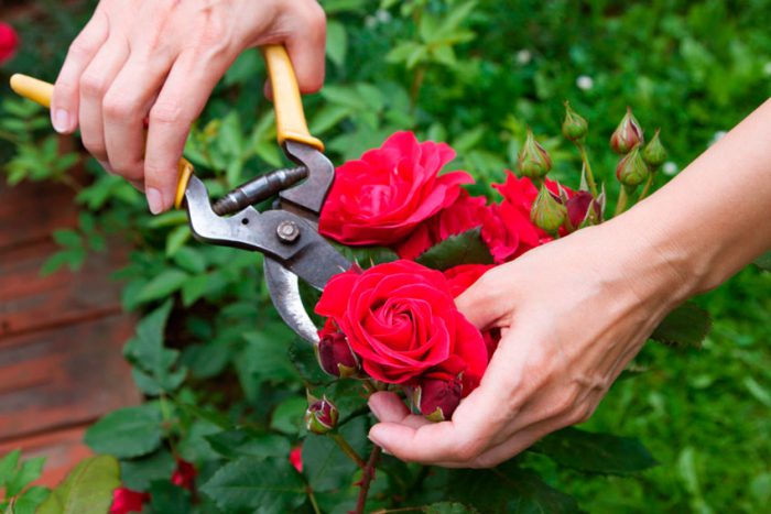 Видалити з куща всі травмовані і слабенькі гілки слід до набрякання бруньок. Ще потрібно обрізати гілки, що ростуть усередину кущика, і далі можна приступати безпосередньо до формуванні. У тому випадку, коли 2 гілочки заважають один одному, треба зрізати ту з них, що розміщується менш вдало або залиште ту, яка молодша (кора має світле забарвлення). При вирощуванні прищепленої кущової троянди потрібно особливу увагу приділити обрізанні прикореневої порослі, бо вона віднімає у квітки велика кількість сил, у результаті чого цвітіння може не настати зовсім. Рекомендується обрізати всі стебла крім найбільш сильних і міцних, які повинні зацвісти вже в нинішньому році. При невмінні правильно обрізати відцвілі кущик, потрібно робити це на власний розсуд. При цьому слід пам'ятати, що після обрізки на стеблах повинно залишитися не менше 2 бруньок. На обрізаному кущику досить швидко з'являється молоденька зелень. Обережність у обрізку треба проявляти в разі, коли грунт вже виснажений або кущик є старим, тому що він вже не здатний так активно відновлювати власну форму. В осінній час слід обірвати всі квіточки, які вже зів'яли й потрібно зрізати пошкоджені, слабенькі гілки або ті, що ростуть всередину кущика. Обов'язково проведіть обробку місць зрізів садовим варом.