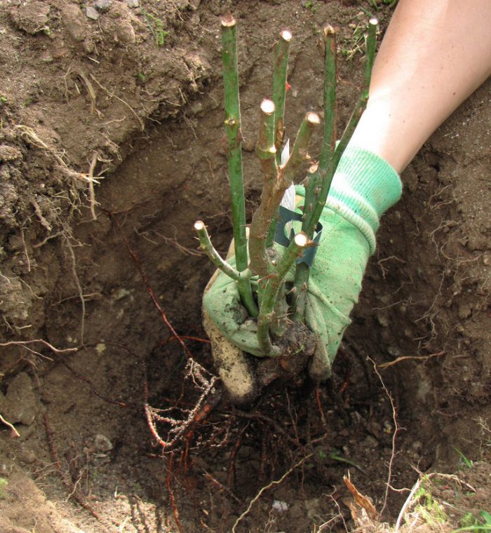 Перш ніж висаджувати саджанці у відкритий грунт, їх необхідно підготувати. Робиться це безпосередньо перед посадкою. Вам знадобиться дуже гострий інструмент, який потрібно обов'язково простерилізувати. За допомогою нього потрібно підрізати корінці, при цьому повністю зрізавши висохлі, а також вкоротити пагони на висоту від 15 до 20 сантиметрів. Потім кореневу систему слід занурити у воду на кілька годин і витягнути безпосередньо перед висадкою. Підготуйте ямку округлої форми, діаметр якої ― від 40 до 50 сантиметрів. При цьому треба пам'ятати, що глибина ями повинна на 10 сантиметрів перевищувати висоту кореневої системи, вимірюваної разом з грудкою землі. Дно ямки треба розпушити, скориставшись вилами. Для того щоб визначити точну глибину посадкової ямки, слід врахувати, на якій висоті розташовується щеплення. Так, після посадки вона повинна перебувати на глибині 3-4 сантиметри.