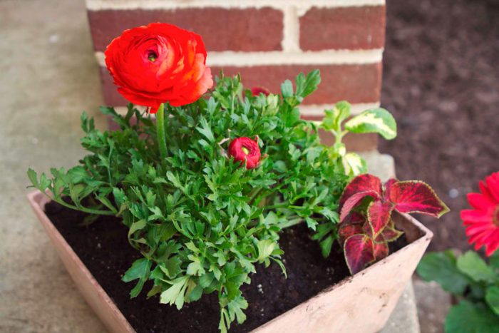 Доглядати за жовтцям зростаючими на балконі також не складно, як і за тими, що вирощуються на садовій ділянці. Однак для того щоб рослина росла та розвивалась добре, слід пам'ятати про деякі правила і секрети. У кімнатних умовах такий квітка не слід вирощувати як одиночний, тому в один горщик рекомендується зробити висадку відразу декількох кущиків. Для посадки можна використовувати як декоративний ящик, так і досить об'ємний горщик, придбаний в магазин, в якому на денці обов'язково повинні бути отвори для дренажу. Для посадки вам знадобитися точно такий же грунт, як і на садовій ділянці, а точніше, грунт на основі торфу. Перед посадкою бульби слід занурити у воду на 24 години. На денце горщика або скриньки слід укласти хороший дренажний шар, для цього підійде керамзит, щебінь або шкаралупа від яєць. Потім всипається земля і на її поверхню викладаються бульбочки. Їх необхідно засипати грунтом таким чином, щоб лише верхівки височіли над поверхнею. При достатньому обсязі квіткового горщика в нього можна висадити відразу кілька бульбочок. Гарненько полийте і приберіть на перший час у досить прохолодне місце (близько 12 градусів). У міру необхідності треба проводити зволоження грунту.