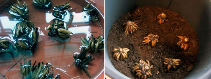 У підготовлену посадкову яму треба опустити бульба обов'язково «дзьобиком» вниз на глибину від 5 до 8 сантиметрів. Між рослинами необхідно витримувати відстань від 10 до 15 сантиметрів. У тому випадку, якщо очікуються заморозки, то посадки слід накрити соломою або спеціальним укрывочным матеріалом. Через 2-3 місяці на кожному кущику зросте кілька квітконосів, а цвітіння почнеться ще через якийсь час.