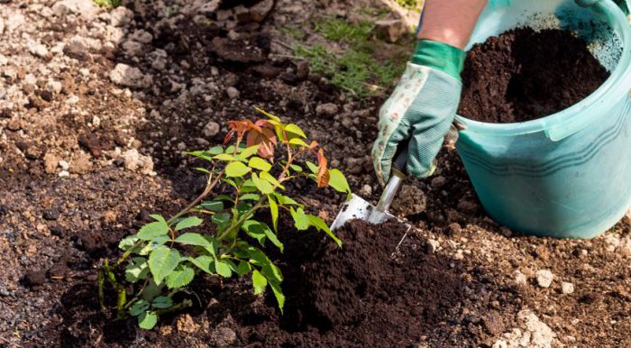 Ямка для посадки троянди повинна мати розміри 50х50. При цьому між посадочними ямами повинна дотримуватися дистанція не менше 100 сантиметрів. Верхній шар ґрунту найбільш насиченими живильними речовинами потрібно зняти з выкапываемой ямки і з'єднати з ½ частиною відра гною. Частина отриманої землесуміші необхідно всипати в ямку, а потім в неї треба влити порівняно велику кількість води. Дану процедуру потрібно провести за добу-дві до передбачуваної висадки рослини. В той день, коли ви зберетеся посадити саджанець, необхідно приготувати спецраствор, для того щоб обробити систему коріння перед посадкою. Для приготування розчину треба розчинити 1 таблетку гетероауксину, 3 таблетки фосфоробактерина в 500 мл води. Потім цю рідину влийте в 9,5 л глиняного бовтанки. Перш ніж саджанець опустити в ямку, його корінці слід занурити в підготовлену суміш. У ямку слід горбком всипати суміш грунту з гноєм. Потім в ямку потрібно помістити саджанець, при цьому акуратно розправивши його корінці. Засипте ямку тієї ж сумішшю грунту з гноєм і гарненько ущільніть поверхню грунту. Не забувайте, що місце, де знаходиться щеплення, повинне бути заглиблено на 10 сантиметрів у землю. При цьому у кореневласних саджанців потрібно кореневу шийку заглибити на 5 або більше сантиметрів у землю. Посаджену рослину треба добре полити. Після того як рідина вбереться в грунт, в лунку треба буде додати суміші грунту з гноєм. Потім рослину підгортає на висоту 20 сантиметрів або більше.