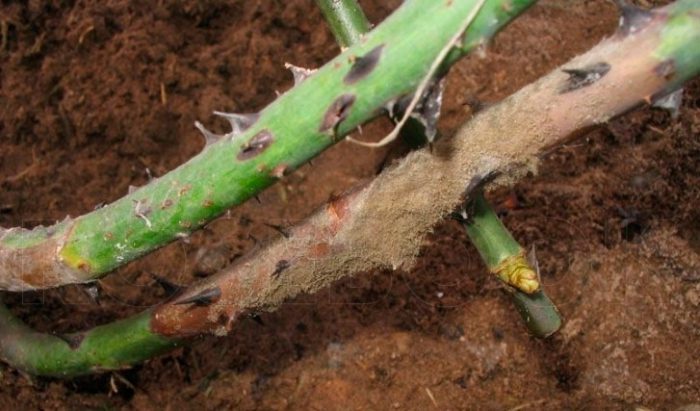 На частинах троянд з'являється наліт білуватого відтінку, який поступово стає бурим. Появи такого захворювання може спровокувати висока вологість повітря, різка зміна температур, надмірна кількість азоту в грунті і порушення правил поливу. Частини троянди, які уражені хворобою треба зрізати і знищити. Далі слід провести обробку рослини, використовуючи для цього розчин мідного купоросу (2%) або залізного купоросу (3%).