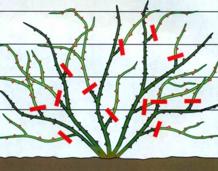 Дані рослини потребують обрізки, так як саме вона дозволяє сформувати красиву крону, зробити цвітіння більш рясним, причому по всій висоті кущика, поліпшити його декоративні якості. Якщо обрізати рослину правильно, то воно буде радувати своїм цвітінням протягом усього періоду інтенсивного росту. Вегетативні стебла заслуговують особливої уваги, так як основна частина квіток утворюється на минулорічних стеблах. Обрізати троянду слід у весняний або осінній час. На самому початку періоду інтенсивного росту абсолютно у всіх плетистих троянд необхідно прибрати відмерлі стебла, а також ділянки, які були обморожені. А також слід зрізати кінчики стебел до самої сильної зовнішньої нирки. Наступні процедури обрізання будуть безпосередньо пов'язані з тим, скільки раз цвіте конкретна троянда, один або кілька.
