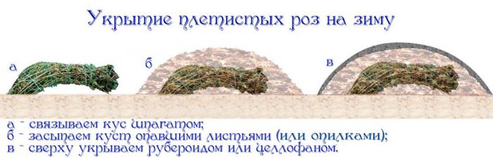 Накрити рослину потрібно, коли температура повітря стане нижче мінус 5 градусів. Робити це раніше не слід, тому що квіти повинні загартуватися, а також вони можуть почати пріти або зростати (що пов'язано з тривалим перебуванням під укриттям без повітря). Укриття слід проводити не дощову безвітряну погоду. Зі знятих пагонів треба видалити листочки, зрізати пошкоджені стебла, обв'язати батоги, скориставшись мотузкою, і потім обережно покласти їх на підстилку. Для її створення можна використовувати сухі листочки або лапник. Не кладіть рослина на голу землю. Притисніть або зафіксуйте рослина на поверхні ґрунту, а поверх засипте сухими листочками або травою, а також можна використовувати лапник. Підстава кущика треба присипати грунтом або піском, а потім накрийте рослина лутрасілом, плівкою з поліетилену, руберойдом або іншим матеріалом, який здатний не промокати. Між рослиною і укриттям повинна залишитися прошарок повітря.