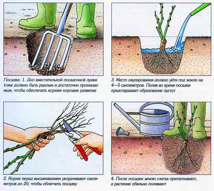 Саджанці, які мають відкриту систему коренів, необхідно на 1 день занурити в ємність з водою, і робити це слід безпосередньо перед висадкою у відкритий грунт. Після цього слід обірвати всі листочки і відрізати, використовуючи секатор, ті стебла, які є незрілими або були пошкоджені. Також слід провести підрізування кореневої системи і надземної частини, залишивши по 30 сантиметрів. Місця зрізів слід обробити подрібненим деревним вугіллям. Якщо ви використовуєте для посадки щеплені саджанці, то в них необхідно акуратно прибрати всі бруньки, які розташовуються нижче щепи. Справа в тому, що з них почне рости пагони шипшини. Далі посадковий матеріал слід піддати дезинфекції. Для цього його треба занурити в розчин мідного купоросу (3%).