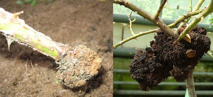На поверхні рослини з'являються різного розміру нарости дуже м'які і горбкуваті. Через якийсь час вони стають більш твердими і темними. Це призводить до засихання і загибелі рослини. Вилікувати таку хворобу можна. Під час придбання саджанців треба гарненько їх оглянути, а перш ніж їх садити, потрібно піддати дезинфекції кореневу систему, зануривши її на 2-3 хв. в розчин мідного купоросу (3%). При наявності ознак хвороби на дорослій рослині, уражені частини треба негайно обрізати, при цьому зрізи потрібно обробити тим же тривідсотковим розчином.