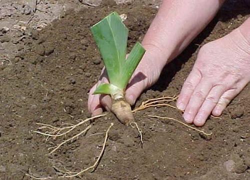 Куплений посадковий матеріал, а також і той, що зберігався весь зимовий період, необхідно обробити засобом, стимулюючим зростання (Циркон або Екогель). Якщо довгі корінці, то їх треба підрізати, місця, де є сліди гниття, потрібно акуратно вирізати. Корінь слід на третину години опустити в розчин марганцевого калію для дезінфекції. Зробіть не дуже глибоку лунку і всипте в неї горбком пісок. Кореневище ірису бородатого треба укласти так, щоб воно було розташоване горизонтально. Розправте корінці і присипте лунку так, щоб над поверхнею грунту залишилася лише верхня частина кореневища. Потім ірис треба рясно полити. У тому випадку, якщо всі кореневище опиниться під землею, то це, як правило, призводить до появи гнилі. Безбороді види навпаки необхідно заглибити в грунт на кілька сантиметрів. Зверху слід насипати шар мульчі (торф або опале хвоя), що допоможе зберегти вологу. Лунки треба розташовувати один від одного на відстані не менше 50 сантиметрів.