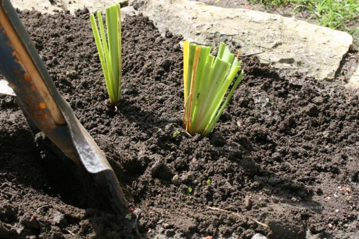 - Посадку ірису бородатого виробляють з використання піску. У підготовлену луночку на дно всипається гіркою пісок, і корінці розправляються вже по ньому. Слід врахувати, що якщо сильно заглибити рослина, то воно може загинути або ж не зацвіте.