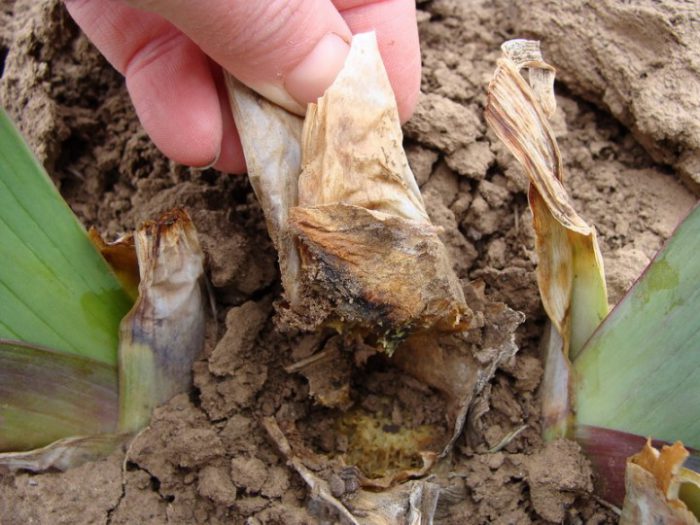 Найбільше схильні до різних шкідників і захворювань найбільш ефектні і строкаті сорту. Для того щоб уберегти іриси від хвороб, потрібно в обов'язковому порядку дотримуватися всіх правил агротехніки виду. Також обов'язково спостерігайте за тим, як почуваються рослини на протязі всього сезону. Як тільки ви помітите, що з ірисами щось не так, слід вжити відповідних заходів. При зараженні кущика фузаріозом або іншими гнилями потрібно діяти дуже швидко. Заражене рослину необхідно викопати і знищити. Інші кущики в профілактичних цілях треба обов'язково полити під корінь і за корінцями розчином фундазолу, який повинен бути двопроцентним. Цим засобом також рекомендується обробляти кореневища, перш ніж їх висаджувати в грунт. У такому разі ризик появи гнилей буде значно нижче. Захистити рослини від різноманітних плямистостей зможе розчин бордоської суміші (1%), яким слід обприскувати листя.