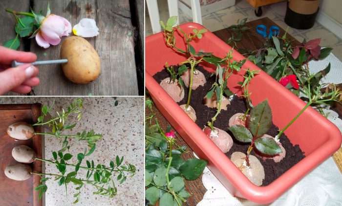 Укоренити живці даної рослини можна в картопляному бульбі. Для цього у весняний час проривається траншея, глибина якої повинна бути близько 15 сантиметрів. Місце для неї слід вибрати сонячне і має захист від поривів вітру. На дно слід всипати п'ятисантиметровий шар піску. Підготуйте живці, довжина яких повинна бути приблизно 20 сантиметрів. З них треба обірвати всі листочки і шипи. З молодого картопляного бульби середнього розміру необхідно вирізати всі вічка. Застроміть в картоплю підготовлений держак, і опустіть її в траншею. Закопайте на 2/3 довжини, при цьому відстань між живцями має бути близько 15 сантиметрів. У перші дні живці слід накрити банками зі скла. Успіх такого вкорінення полягає в тому, що встромлена в бульбу частина черешка знаходиться в постійно вологому середовищі, а ще рослина насичується крохмалем і корисними вуглеводами. Даний спосіб користується найбільшою популярністю. Забезпечте растеньицам систематичний полив. При цьому 1 раз в 5 діб їх потрібно поливати підсолодженою водою, так, на 200 г води береться 2 маленькі ложки цукрового піску. Через півмісяця почніть гартувати молоденькі троянди, прибираючи на деякий час укриття. Через півмісяця укриття прибирають назовсім.