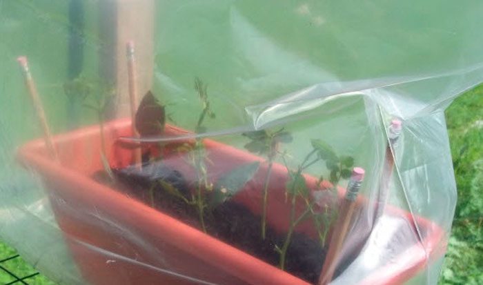 Підготовлені живці троянд треба покласти в пакет, в який попередньо засипається простерилизованный субстрат або сфагнум змочений в розчині соку алое (1 частина соку і 9 частин води). Потім пакет слід надути і добре зав'язати. Його необхідно повісити на вікно. З-за високої вологості всередині пакету утворюється подобу туману, і приблизно через 4 тижні на черешках з'являються перші коріння. Потім їх потрібно висадити, так як про це розказано вище.