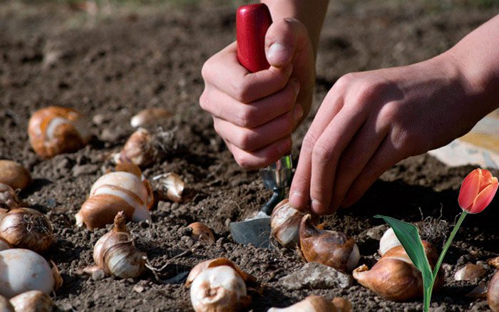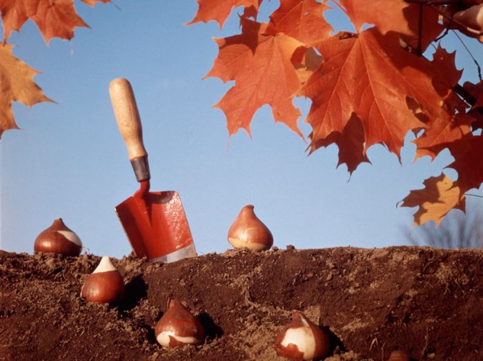 В осінній час важливо правильно садити тюльпани і забезпечити їх необхідним доглядом. Справа в тому, що зовсім скоро настане зимовий період і те, як перезимують рослини, і наскільки вони будуть ефектно цвісти у весняний час, безпосередньо залежить від того, наскільки успішно ви потрудилися восени. Перш ніж садити тюльпани, необхідно провести ретельний огляд їх цибулинок. Так, ті, що мають ознаки якого-небудь захворювання або ушкодження, слід знищити. Досвідчені квітникарі рекомендують проводити висадку по сортах. У цьому випадку догляд за рослинами не буде настільки складним, і простіше викопати цибулини. Перед тим як займатися безпосередньо посадкою, цибулину потрібно на півгодини–годину замочити в 5%-му розчині марганцевого калію. Садити їх потрібно точно також, як і у весняний час. В легкий грунт цибулину потрібно садити на глибину рівну її 3-м діаметрам, а в більш важкий ― 2-м. Обов'язково потрібно замульчувати поверхню ґрунту. Для цього відмінно підійде торф, солома, сухе листя, а також тирсу.