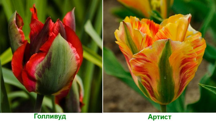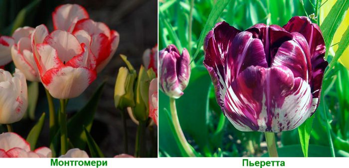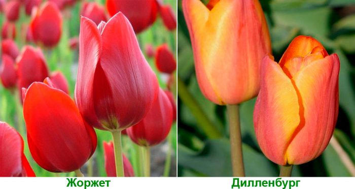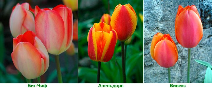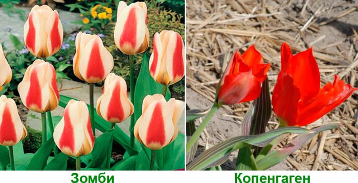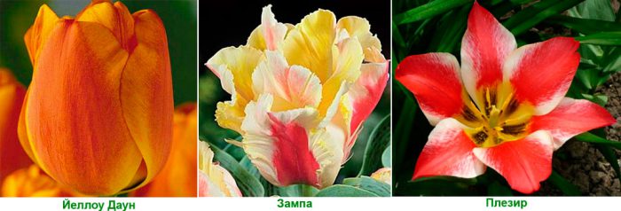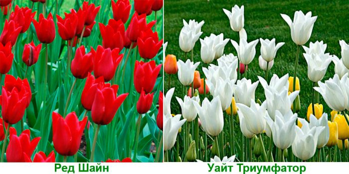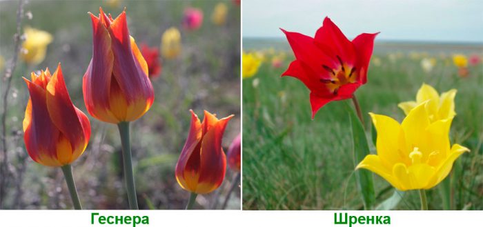 Більшість видів таких кольорів, культивованих людиною, мають відношенню до виду іменованому Tulipa gesneriana. А в дикій природі можна зустріти види: Tulipa sylvestris (тюльпан лісовий), Tulipa biebersteiniana (тюльпан Біберштейна), Tulipa biflora (тюльпан двуцветковый), а також Tulipa greigii, Tulipa pubescens, Tulipa eichleri та ін.