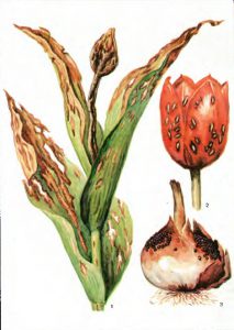Така рослина піддається серпневого захворювання, розвитку якого сприяє вірус некрозу тютюну. Дізнатися про те, що тюльпан заражений можна за искривившемуся втечі і з понівеченої смужками квітці, на луковичках також з'являються плями темного кольору. Заражений квітка потрібно знищити. Для цього його викопують прямо із земляною грудкою, а в отриману ямку слід влити дуже міцний розчин, для приготування якого на літр води береться 3 г борної кислоти і 10 грам марганцевого калію. У ямку слід заливати гарячий розчин. А можна замість розчину насипати в ямку деревну золу. В цілях профілактики здорові тюльпани обробляють розчином фундазолу.