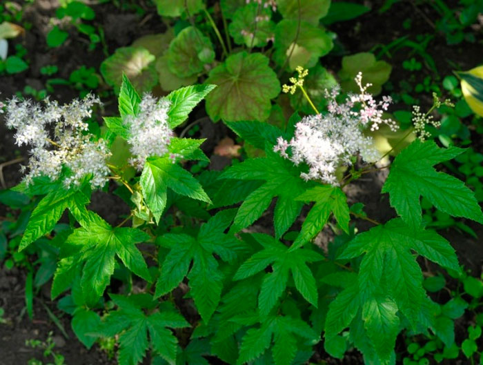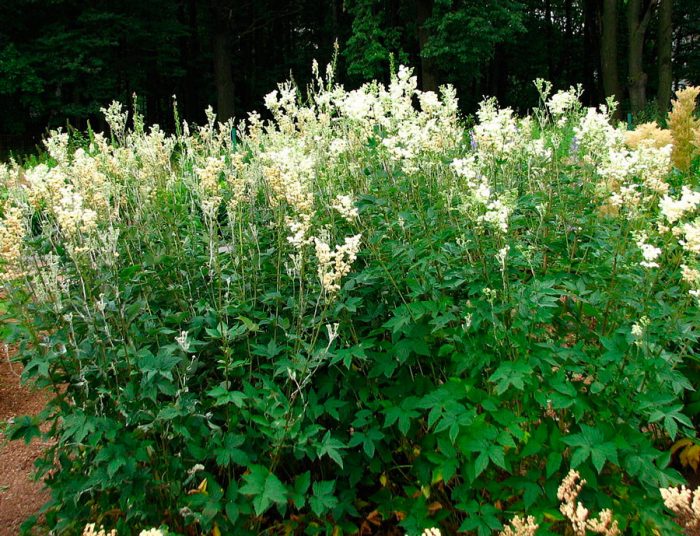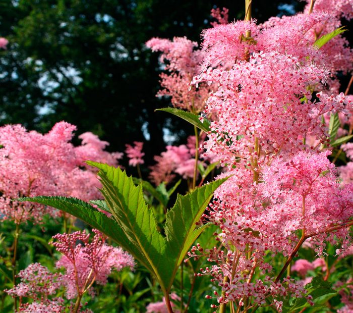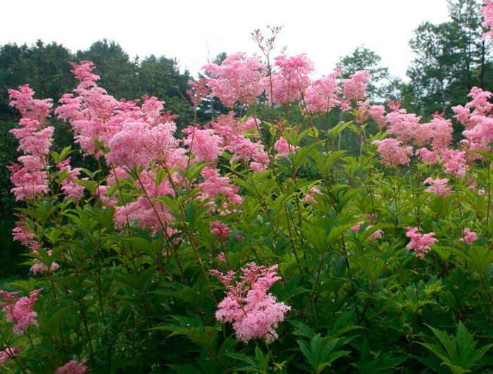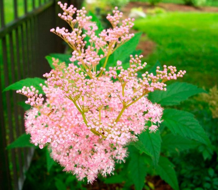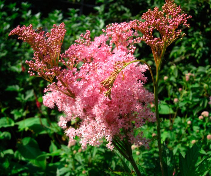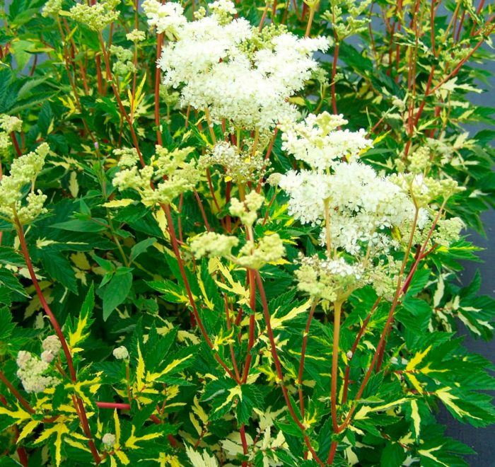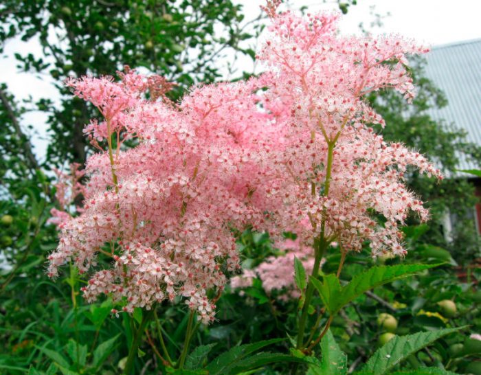 Маленькі квітки пахнуть медом, а вони пофарбовані в бежевий або білий відтінок. Складаються квітки з 5 пелюсток і досить довгих тичинок. Цвіте чагарник протягом 3-3,5 тижнів у червні та липні. Пишні волоті у довжину сягають від 15 до 20 сантиметрів. Кущ виглядає ефектно лише в період цвітіння, а під час формування плодів він забарвлюється в темний відтінок. Ця рослина в народі ще називають білою травою, таволгою вязолистной, медовником, мокрим малинник, белоголовником, сорокоприточником, таволожником, медункой болотної.