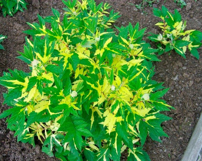 Чагарник формує щільні зарості, при цьому висота стебел може варіюватися від 100 до 170 див. Великі перисто-розсічені листкові пластини складаються з п'яти - або трилопатевих часток. Лицьова поверхня у них темного зеленого відтінку, і прикрашена штришками і цятками жовтого кольору. Нижня частина в листя забарвлена в більш блідий відтінок. Від листя виходить дуже приємний запах. Потужні пагони пряморослі пофарбовані в коричнево-червоний колір. Горизонтально розташовані розгалужені кореневища товщиною з палець мають безліч нирок. З них в літній час формуються квітконосні стебла, які через певний час утворюють щільні зарості.